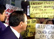 Empleados civiles en actividad de las Fuerzas Armadas protestaron al término de la misa dominical de la catedral de Lima en demanda del apoyo del arzobispo Juan Luis Cipriani a sus reivindicaciones.