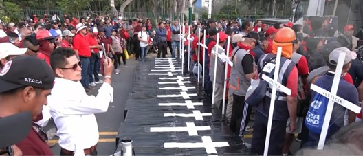 En la Avenida de la Peruanidad protestaron con ataúdes en conmemoración de sus 24 trabajadores de construcción asesinados