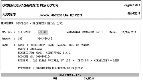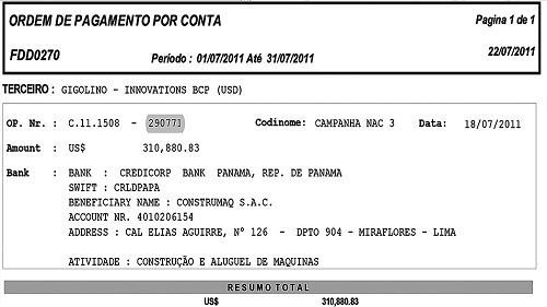 Hoy, según los archivos de Marcelo Odebrecht, la “Caja 2” del grupo transfirió a Construmaq SAC, de Monteverde con el código “Campaña Nac 3”, presunta referencia al Partido Nacionalista Peruano, que este niega, las siguientes sumas: US$ 310,880.83 (18 de julio), US$ 310,880.83 (15 de agosto- 2011), US$ 207, 253,89 (19 y 23 se setiembre – 2011); US$ 310, 880.83 (6 de octubre 2011), US$ US$ 310, 880.83 (10 de octubre -2011), desde el Credicorp Bank de Panamá, lo que totaliza US$ 1’450,777.21