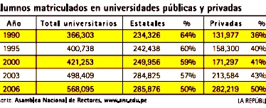 Más allá de los diferentes argumentos del gobierno, la realidad es que le interesa poco las universidades públicas. La razón es simple: desde la década del 90, cuando empiezan las reformas neoliberales, la importancia de las universidades estatales ha decrecido. En 1990, el 64% de los alumnos estudiaba en universidades estatales y el 36% en universidades privadas. En el 2006, según la Asamblea Nacional de Rectores, la matrícula es 50-50. Lo mismo con la cantidad de profesores: 22,398 en las universidades estatales y 22,244 en las universidades privadas.