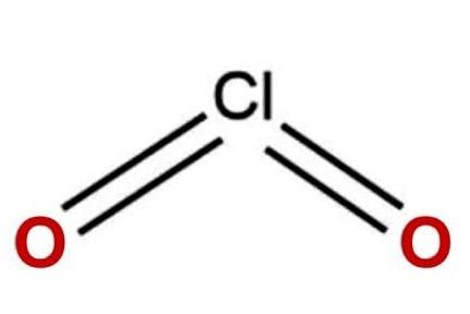 Molécula de dióxido de cloro, compuesta de un átomo de cloro y dos de oxígeno.