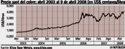 El alza de los precios del cobre ya va por el quinto año y muchos dicen que se mantendrá en esos niveles durante varios años. Recordemos que el precio estaba en US$ 0.62/libra en el 2002, llegando en el 2007 a un precio promedio de US$ 3.22/ libra. Esta semana el cobre tocó el cielo, superando los US$ 4/libra.