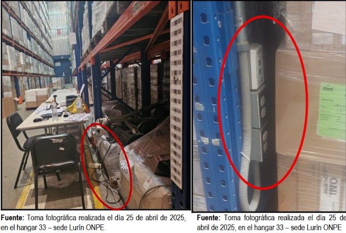 Según el Informe de Control N.° 001-2025-OCI/3599-SVC, en el almacén de la ONPE, ubicado en Lurín, se constató que en el Hangar 33 se almacenan ordenadores de procesos electorales que incumplen las condiciones para la conservación y seguridad, situación que podría ocasionar la pérdida y deterioro de los equipos afectando su integridad y la finalidad para el propósito que fueron adquiridos.
