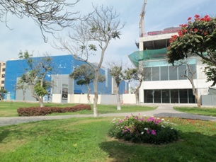 Foto 2. Tercer piso del complejo, con vista a la calle Mantaro. A la izq. del retrato de dos jugadores de la selección hay una barrera de material prefabricado que impide tomar fotografías a los trabajos de las obras que se realizan para anular dicha calle. ¿Por qué quieren mantener ocultos estos «trabajos»?, ¿qué temen?