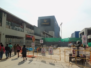 Foto 1. Vista desde la Av. Riva Agüero. Barrera de material prefabricado blanco que cierra la pista de la calle Mantaro e impide su conexión con la Av. Riva Agüero. El edificio azul de la izq. es el cine Planet, cuya fachada y puerta de ingreso (frente a la grúa de la derecha) da a Mantaro.