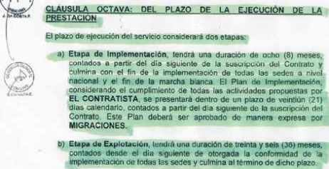 Pero, y así lo hemos venido advirtiendo desde tiempo atrás, hay mucho mar de fondo. El contrato de buena pro firmado por Migraciones, en nombre del Estado peruano y Gemalto-Imprimerie Nationale establece que la entrega de los biométricos se hará en el plazo de ¡8 meses!, es decir en julio del 2016. Nadie podía llamarse a engaño con esta cláusula de un convenio que ¡jamás! debió haber sido suscrito. Adjuntamos texto completo del acuerdo.