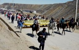 Con carteles en mano, banderas, silbatos y megáfonos, unos a pie y otros a caballo, los comuneros vitoreaban lemas y cánticos sobre la defensa de sus territorios, denunciando el abuso de la empresa minera Volcán y los graves problemas de salud que afronta la población campesina.