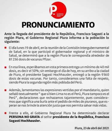 En un comunicado, el gobernador explicó que este lunes se había acordado en la Comisión Intergurbenamental de Salud, en presencia del gobernador y el ministro de Salud, entregar 81,236 dosis de la vacuna Pfizer, pero Sagasti entregó sólo 9,360.