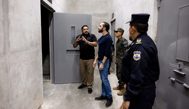El presidente de El Salvador Nayib Bukele inspeccionando la nueva megacárcel