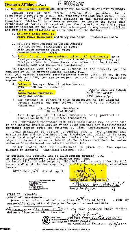 Con la finalidad de informar al comprador del inmueble que Kuczynski era estadounidense y que por lo tanto no era necesario efectuar la retención, el cazurro agente de Wall Street juró, afirmó y certificó que él no era extranjero y que era yanqui por los cuatro costados.