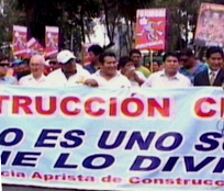Unos 20 mil trabajadores de construcción civil marcharon ayer desde la Plaza Dos de Mayo hasta el Ministerio de Trabajo y Promoción del Empleo (MTPE) en su sede de Jesús María, encabezados por al secretario general de la Confederación General de Trabajadores del Perú (CGTP) Mario Huamán y de la Federación de Trabajadores de Construcción Civil del Perú (FTCCP), Teobaldo Bravo, en demanda de aumentos, denunciando a extorsionadores alentados por el gobierno y solicitando mayor seguridad para sus agremiados.