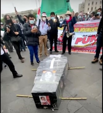 Ante las maniobras de la candidata de Fuerza Popular Keiko Fujimori, quien no acepta su clara y tercera derrota y recurre a un sinfín de leguleyadas para dilatar la proclamación del virtual presidente Pedro Castillo por parte del Jurado Nacional de Elecciones, simpatizantes de Castillo realizaron una marcha fúnebre para la candidata.