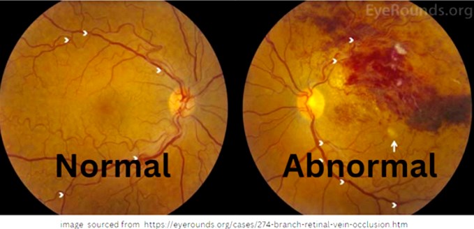 Ojo normal, izquierda, y ojo con oclusión arterial retinal, derecha. EyeRounds.org