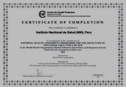 La Organización Mundial de la Salud (OMS) a través del Centro para Protección de la Salud de Hong Kong Colaborador de la OMS entregó al Instituto Nacional de Salud (INS) del Ministerio de Salud, por segundo año consecutivo la certificación de competencia internacional para la detección de virus Influenza por PCR.