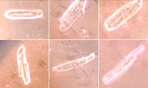 Contracciones de una célula normal del músculo cardíaco (arriba a la izquierda) y de células del músculo cardíaco 48 horas después de la administración de las vacunas de ARNm contra la COVID-19. (Rolf Schreckenberg)