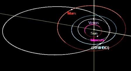 Órbita del 2019 OD, más grande que las órbitas de la Tierra y Marte. Gráfico: Jet Propulsion Laboratory, NASA.