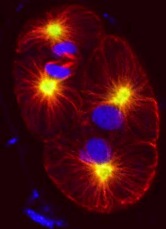 Embrión bicelular Caenorhabditis elegans (nemátodo) transformándise por división en embrión tetraceluar. DNA en azul está asociado con el microtúbulo (rojo), que está organizado por el centrosoma,visualizado usando anticuerpos contra la kinasa AIR-1/Aurora (amarillo).