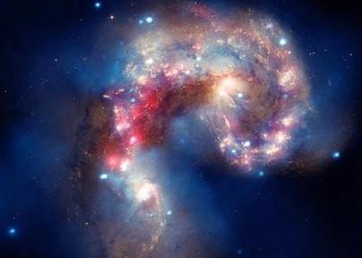 Con los tres observatorios los astrónomos compusieron un gráfico de estas galaxias. Los rayos X del Chandra se ven en azul y muestran las nubes de gas interestelar llenos de elementos pesados creados en la supernova. Se trata del nacimiento de una nueva, segunda generación de estrellas y sus planetas orbitantes. El gas y el polvo contienen elementos como magnesio, silicona, oxígeno y hierro.
