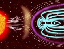 | Gráfico de un viento solar chocando con el campo magnético de la Tierra. Esa. |