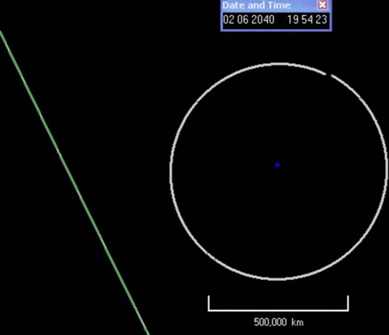 En el gráfico, la Tierra es el tenue punto azul. La cirfunferencia blanca es la órbita de la Luna y la línea verde la probable trayectoria del asteroide en 2040.