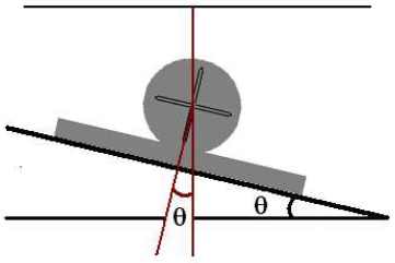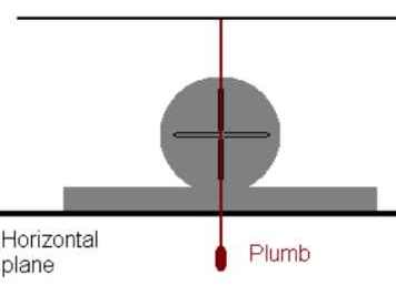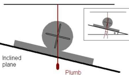 En estas figuras se ve cómo cuando el instrumento se inclina, el ángulo que forma con la plomada (en rojo) es igual al ángulo por encima del plano horizontal.
