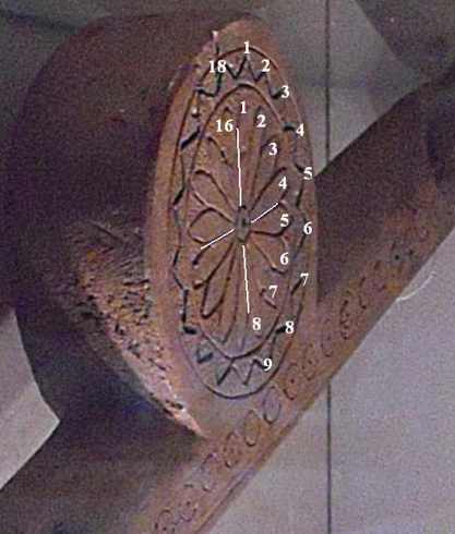 Pero Sparavigna plantea que era otra clase de instrumento de arquitectura, un transportador. Explica que la clave radica en los números codificados como adorno decorativo, que se asemejan a un compás, una rosa de los vientos con 16 pétalos espaciados uniformemente, rodeada de un zigzag circular con 36 puntas.