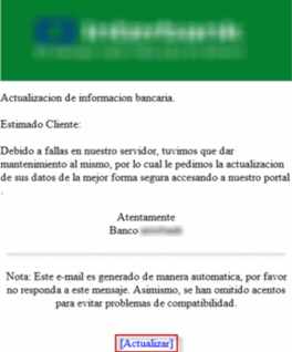 Cuando se coloca el puntero sobre “Actualizar”, se observa que el enlace relacionado está escondido detrás de un acortador. Al hacer clic, el usuario es redirigido a un sitio web que es visualmente idéntico al sitio original de la entidad bancaria suplantada. Sin embargo, si se observa la barra de direcciones del navegador, se puede ver que la URL nada tiene que ver con el banco; es la URL de una empresa de Perú cuyo servidor ha sido vulnerado para almacenar esta amenaza.