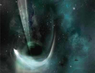 La parte más interna del disco de gas ingresa en espiral al agujero negro, donde el movimiento rápido y el magnetismo crean “embudos” en dirección opuesta a través de los cuales pueden escapar algunas partículas.