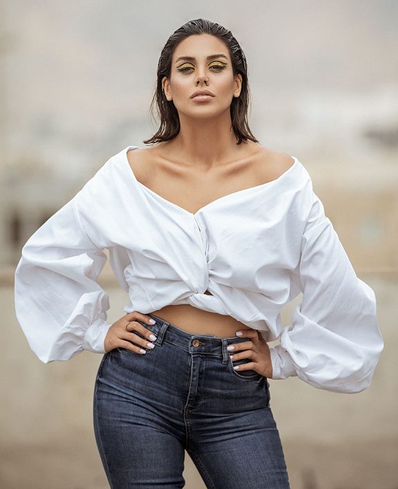 Los jeans se ven estelares con blusas para mujer que tienen más volumen en el busto, en las mangas o en todo el torso. Coge un par de lavado oscuro y vistelos con un mono esmeralda con hombros descubiertos y un escote ondulante. Levanta tu cabello para lucir esos hombros y agrega un toque de brillo con aretes de aro gruesos.