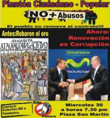 El Colectivo No a Telefónica convoca a un plantón en protesta por el faenón perpetrado por el gobierno del presidente Ollanta Humala, quien renovó el contrato de telefonía móvil e internet con esa empresa exonerándole del pago de 830 millones de dólares, sin tomar en cuenta el servicio de tecnología obsoleta, la doble contabilidad, la explotación laboral, la burla a los pagos tributarios y otros actos bárbaros a los cuales Telefónica se ha acostumbrado en el Perú.