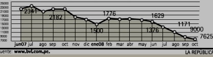Ayer la Bolsa de Valores cayó 10.8% y el Índice General terminó en 7,625 unidades. Así, el Índice de la Bolsa ha retrocedido al mismo nivel que tenía en mayo del 2006.
