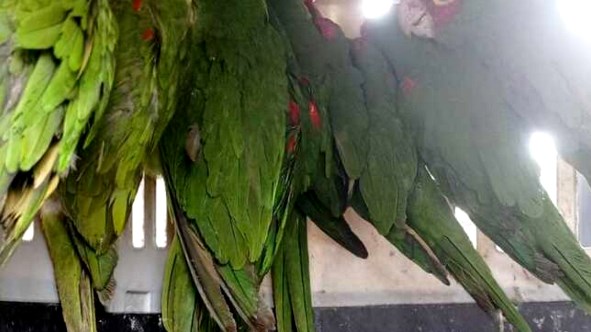 En uno de los sacos había dos cajas de cartón con orificios: una de ellas con 50 pericos esmeraldas (2 muertos) y la otra con 48 ejemplares de la misma especie (2 muertos). En otro saco se halló a los 8 loros de cabeza roja. Todas las aves se encontraban en muy mal estado físico por el hacinamiento y la falta de aire.