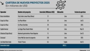 Otros dos proyectos anunciados para el 2025 son Las Vegas Puente Piedra y el Boulevard Gastronómico Paseo Begonias, con inversiones de US$ 40 millones y US$ 13 millones, respectivamente. Se estima que estos dos nuevos malls abrirán sus puertas en mayo y enero del presente año.