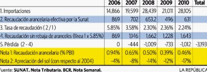 Para calcular la pérdida primero hay que saber cuánto se hubiera recaudado con el arancel promedio “antiguo” de 5.85% (ver línea 4). La pérdida (línea 5) fue más de US$ 1,000 millones en el 2008 y en el 2010. Así, del 2007 al 2010 la Sunat ha dejado de recaudar más de US$ 3,193 millones. Dicho de otro modo, ahora se recauda 0.5% del PBI menos que en el 2006 (Nota 1).