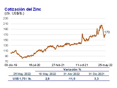 Entre el 18 y el 25 de mayo, el precio del zinc subió 2,8 por ciento a US$/lb. 1,70, informa el Banco Central de Reserva del Perú (BCRP).