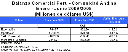 De acuerdo con cifras preliminares tomadas al 16 de julio por el Centro de Comercio Exterior (CCEX) de la CCL, las exportaciones totales del Perú a la CAN (Bolivia, Colombia y Ecuador) durante el primer semestre del año cayeron en 11%, pasando de US$ 745 millones a US$ 663 millones.