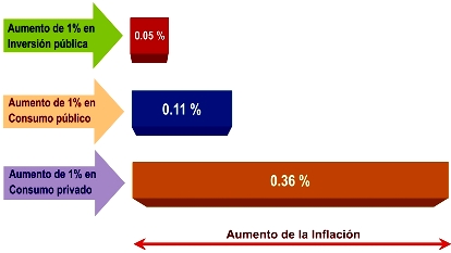De acuerdo con estimaciones del IEDEP, la inflación anualizada aumenta tan sólo en 0.05% cuando se incrementa en 1% la inversión pública, siendo este impacto dos veces mayor en la inflación cuando aumenta el consumo público (0.11%) y siete veces más alto cuando proviene del consumo privado (0.36%).