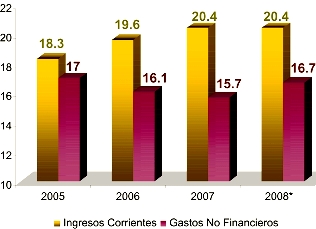 Así se tuvo que durante el año 2007, si bien los ingresos corrientes ascendieron a S/. 69,610 millones (20.4% del PBI), mientras que el gasto no financiero —gasto corriente y gasto de capital, sin considerar los intereses de la deuda externa— ascendió a S/. 53,573 millones (15.7% del PBI).