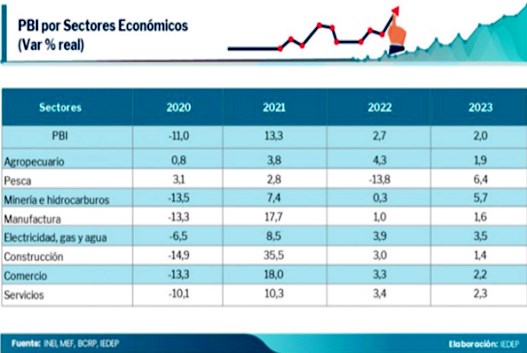 “El crecimiento de 2% proyectado por el IEDEP se apoya en la recuperación del sector Minería e Hidrocarburos (5,7%), rubro que aportó el 11% del PBI del 2022 y cuyo desempeño es constantemente amenazado por conflictos sociales”, comentó el jefe del IEDEP de la CCL, Óscar Chávez.
