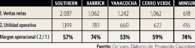 Como se aprecia, este “royalty” tiene el objetivo explícito de captar la sobreganancia: mientras más alto sea el MO, más se paga. En el Perú, podemos apreciar que las empresas de la gran minería tienen todas los MO superiores al 35%, lo que quiere decir que —con la nueva legislación chilena— el “royalty” a pagar oscilaría entre 10 y 12%, cifra muy superior al 3% —fijo— de regalía que actualmente establece la ley peruana.