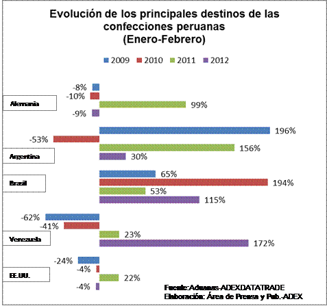 Cifras del Sistema de Inteligencia Comercial ADEX DATA TRADE, señalan que entre enero y febrero de este año las exportaciones de confecciones sumaron US$ 221.5 millones, 20% más que los US$ 184.5 millones del 2011, pero aún menor (-3%) al monto del 2008 (US$ 228.1 millones).