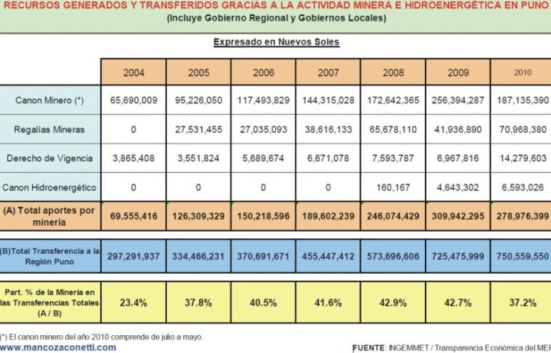 Por ello, el espíritu del progreso, de la superación propios de los aymaras y quechuas de Puno, les permite aceptar la presencia del canon y la regalía minera que ha tenido un crecimiento importante como se puede observar en el cuadro “Recursos Generados y Transferidos Gracias a la Actividad Minera en Puno 2004-2010”. Si bien existe una importante producción de oro que estadísticamente se registra sobre las 100 mil onzas anuales, lo cual hace evidente la subvaloración de la producción aurífera; en lo fundamental la categoría del canon y regalía minera se explica por la presencia de la empresa Minsur del grupo Brescia cuya producción de estaño si bien ha desplazado a Bolivia del liderazgo mundial, la riqueza obtenida no resulta lo suficientemente compartida con la población regional.