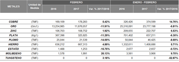 Fuente: Ministerio de Energia y Minas / Estadística Minera Febrero 2017.