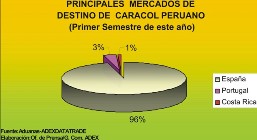 En el 2008, la exportación de caracoles y sus derivados ascendió a US$ 163 mil 418 y tuvo como principal destino a España, seguido muy de lejos por Costa de Marfil y Arabia Saudita.