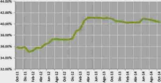 Por último, la Tasa de Interés Promedio de las Tarjetas de Crédito en moneda nacional retrocedió a 40.37% en octubre del 2014, acumulando su cuarto descenso consecutivo. Analizando los resultados del último año vemos que el nivel registrado en el mes de análisis fue menor en 0.16 y 0.55 puntos porcentuales en comparación con septiembre pasado y el decimo mes del 2013, en cada caso. Considerando las medidas de reducción de encaje y de la tasa de interés de referencia por parte del Banco Central, se espera que el costo de financiamiento con tarjetas de crédito se reduzca aún más en los siguientes meses.
