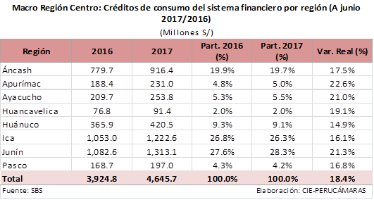 Junín fue la región que lideró las colocaciones de créditos de consumo en la Macro Región Centro con S/ 1,313.1 millones a julio del 2017, es decir, 21,3% más con relación al mismo periodo del año pasado, y una participación de 28,3%.