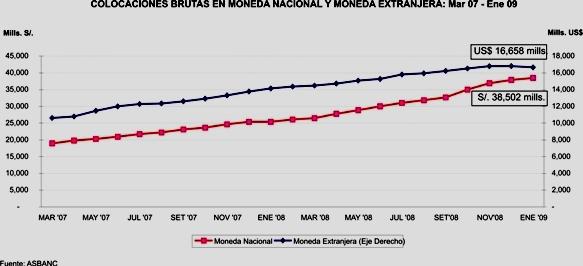 Al término del primer mes del 2009, las colocaciones totales registraron S/. 91,373 millones, cifra mayor en S/. 664 millones (0.73%) en comparación a diciembre 2008. Cabe precisar que para enero 2009 el tipo de cambio fue S/. 3.174 por dólar y para diciembre 2008 fue S/. 3.140 por dólar, lo que influyó en esta variación.