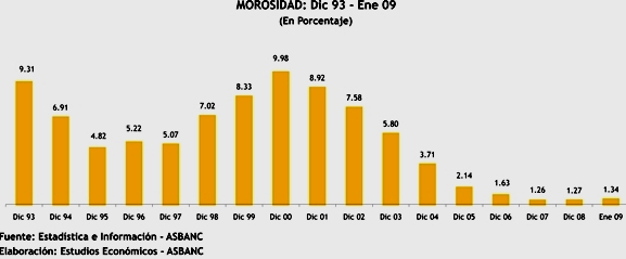 Es importante precisar que el indicador de morosidad reportado en enero 2009 (1.34%) se encuentra muy cercano a los mínimos históricos de la banca peruana (1.19% en setiembre 2008) y alejado de los máximos observados (13.86% en marzo 1993). Asimismo, a nivel de América Latina, se mantiene como uno de los más bajos de la región.