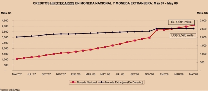 Los Créditos Hipotecarios Totales de la banca privada continuaron mostrando un importante dinamismo como resultado de la fuerte demanda de viviendas por parte de las familias y de los programas habitacionales impulsados por el Gobierno. En ese sentido, al cierre de mayo 2009, los préstamos hipotecarios expresados en nuevos soles registraron S/. 11,658 mills., cifra mayor en S/. 122 mills. (1.05%) respecto a abril 2009[2].