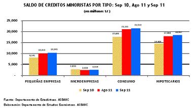 Debe resaltarse que en septiembre 2011, se registró un aumento mensual de los préstamos a los distintos segmentos minoristas. Los créditos a pequeñas empresas aumentaron 3.32% (al pasar de S/. 10,013 millones a S/. 10,345 millones), con lo que mantuvieron su tendencia positiva, acorde al dinamismo de este sector. Asimismo, los créditos microempresa repuntaron 3.45% (elevándose de S/. 2,430 millones a S/. 2,514 millones), impulsados por el inicio de la campaña de fin de año, que origina un aumento de la demanda de financiamiento de un gran número de microempresarios.
